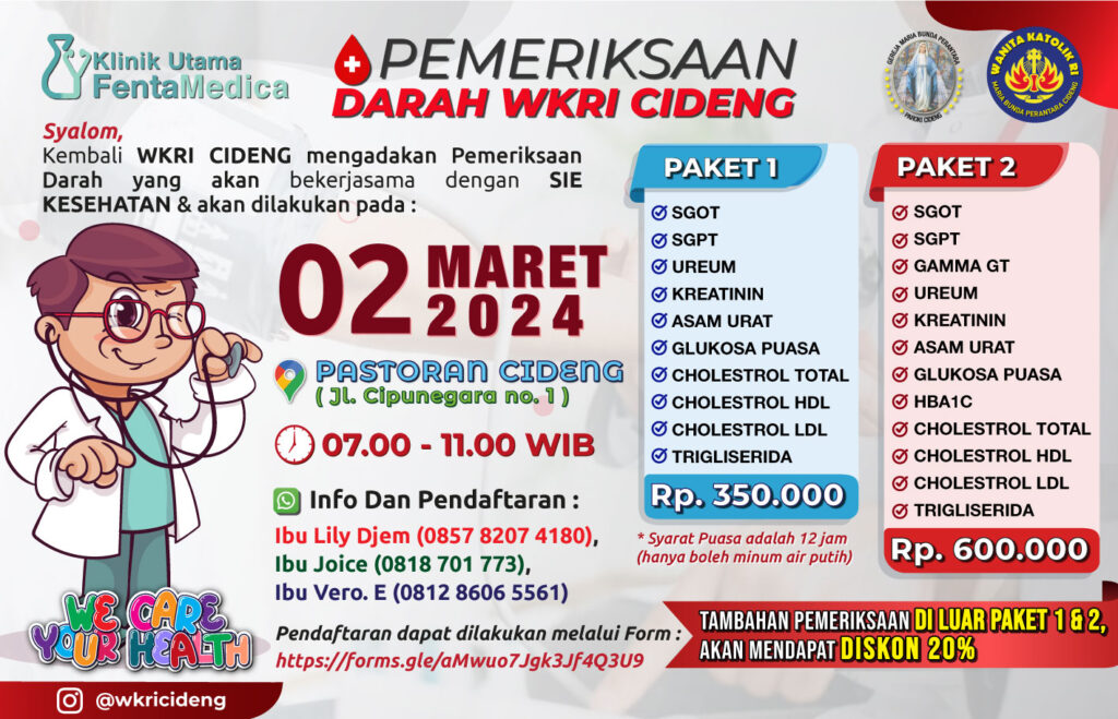 Kembali lagi WKRI bekerjasama dengan Sie Kesehatan untuk mengadakan PEMERIKSAAN DARAH yang akan dilakukan pada: